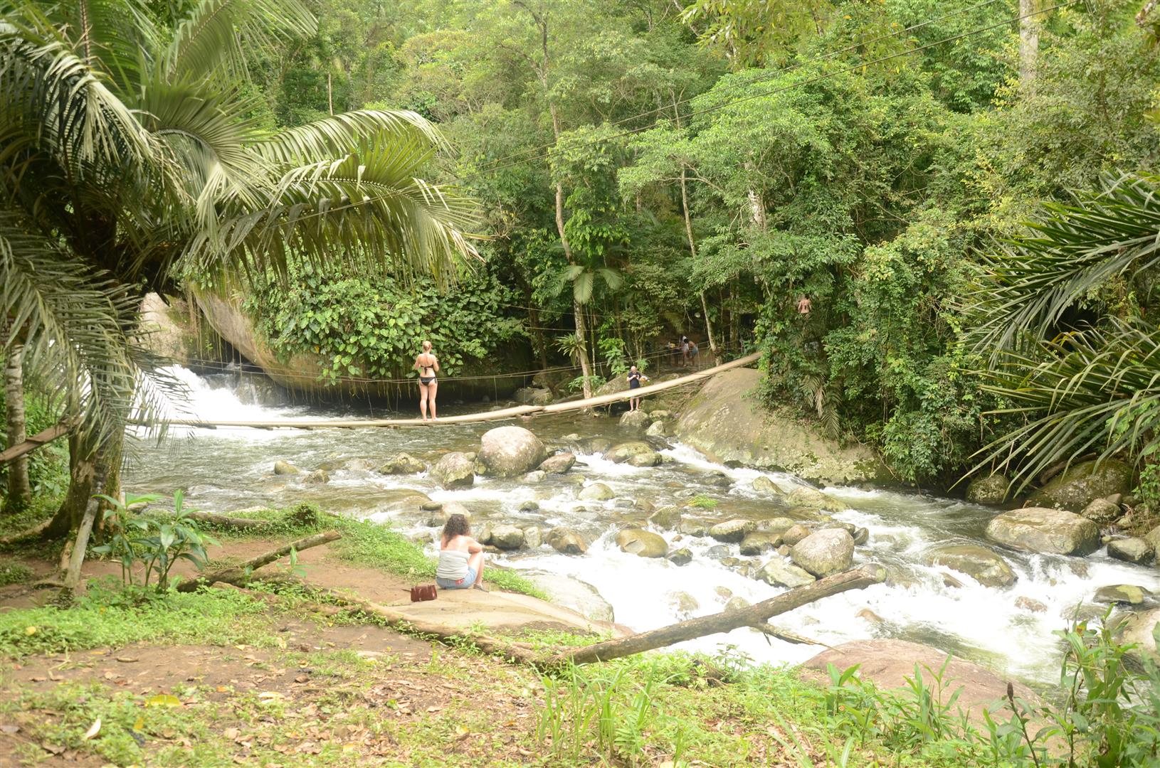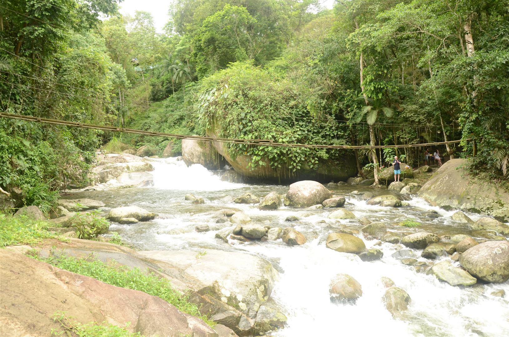 Uma ponte pensil de madeira atravessa por cima do rio, levando a um barzinho que nem sempre está aberto.